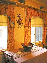 The curtains feature a small-scale floral pattern, and the windows remain exposed. There are pull-down shades to use to block out light, when necessary.